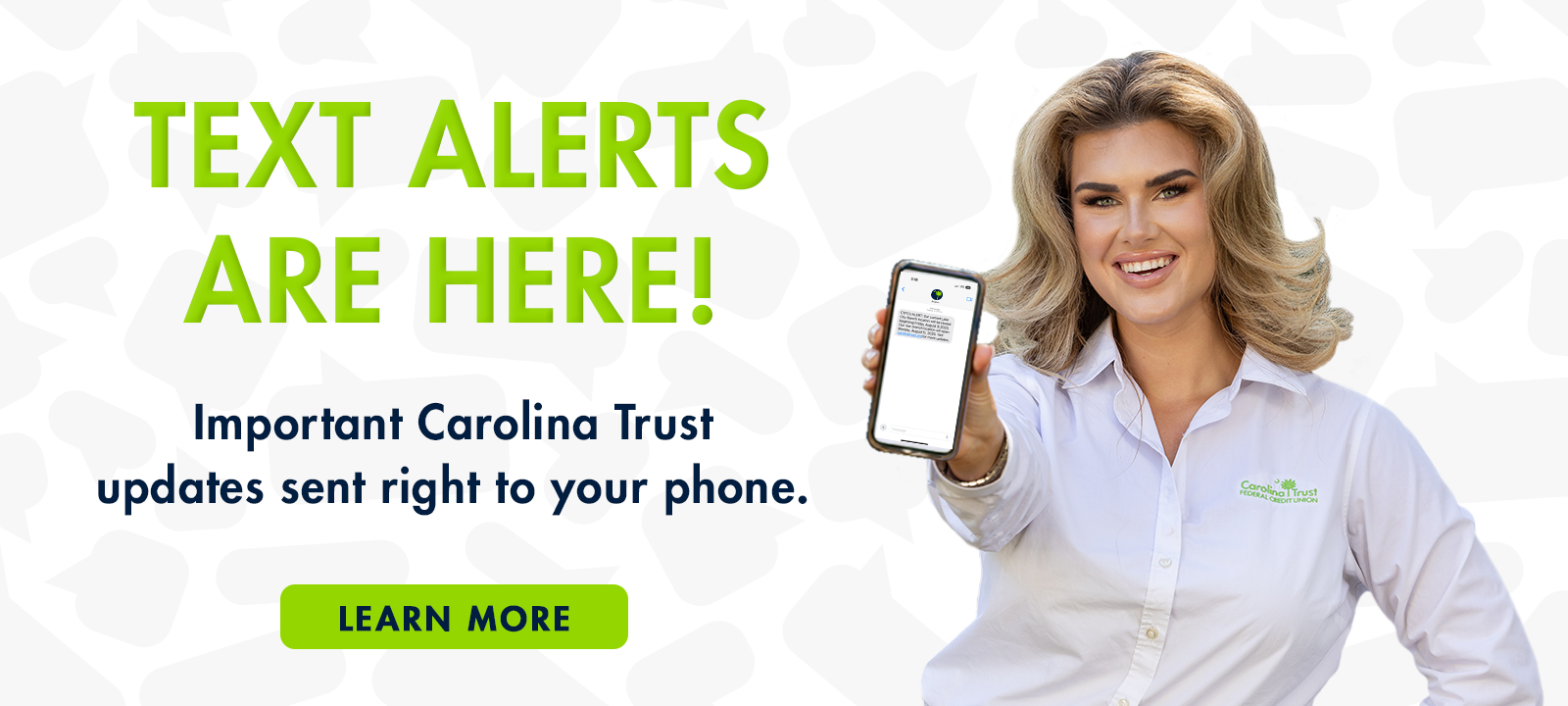 I have been with Carolina trust for over 20 years. I feel safe and protected when I walk into any of the branches. I also appreciate the safety factors that can be set up on my account. I know that my money is safe with Carolina trust.